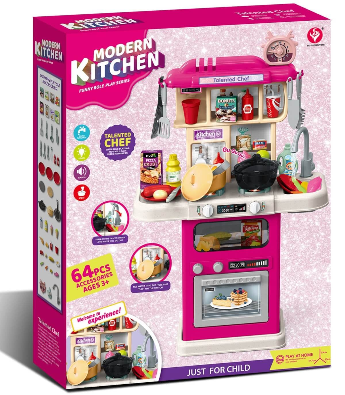 Детска розова кухня с аксесоари и звуци е перфектна интерактивна играчка за ролеви игри с ниско търсене, подходяща за деца над 3 години. Комплектът включва 64 части, сред които мивка, котлон, тенджери, прибори и играчки храна. С реалистични светлини и звуци, тази детска кухня за имитация на готвене стимулира въображението, фината моторика и социалните умения.